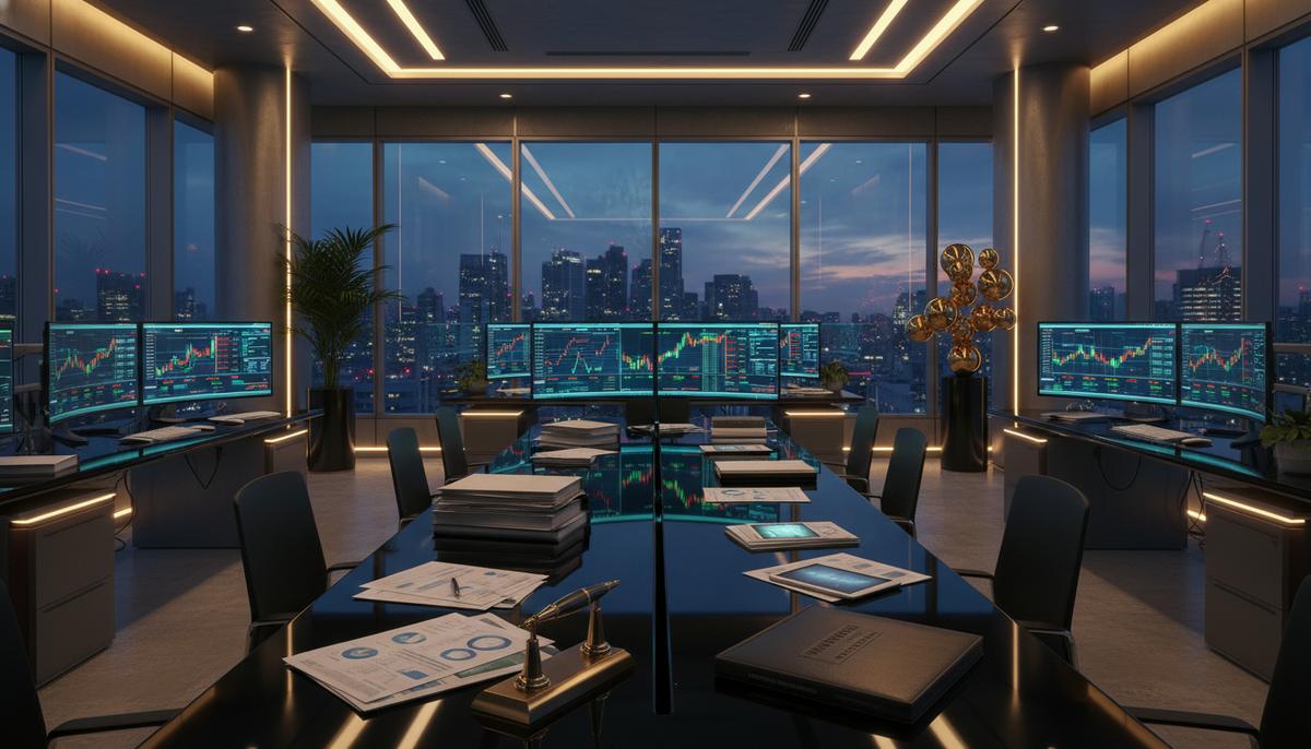 Интерьер современного финансового офиса с большими мониторами, отображающими биржевые графики и финансовые данные, а также столом с документами.