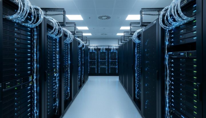 Современный дата-центр с рядами серверных стоек и светящимися кабелями. За окном видна панорама ночного города.