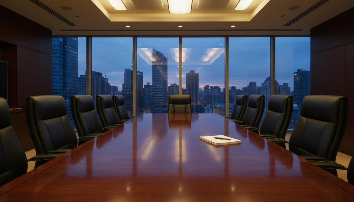 Пустой зал заседаний в современном офисе с длинным полированным столом, креслами и панорамным видом на город из окна.