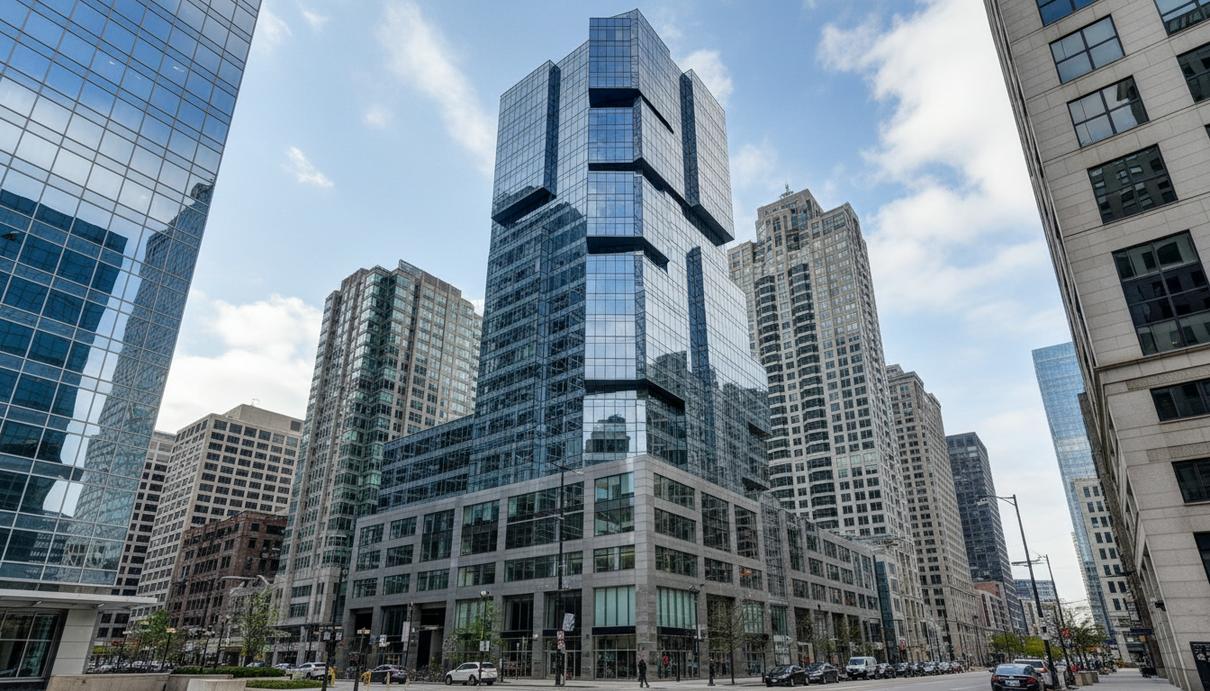 Стеклянный фасад современного офисного здания в деловом квартале Чикаго