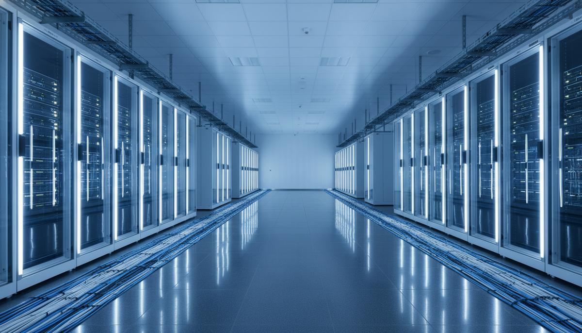 Современный центр обработки данных банка с рядами серверных стоек, светящимися индикаторами и аккуратно проложенными кабелями.