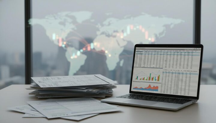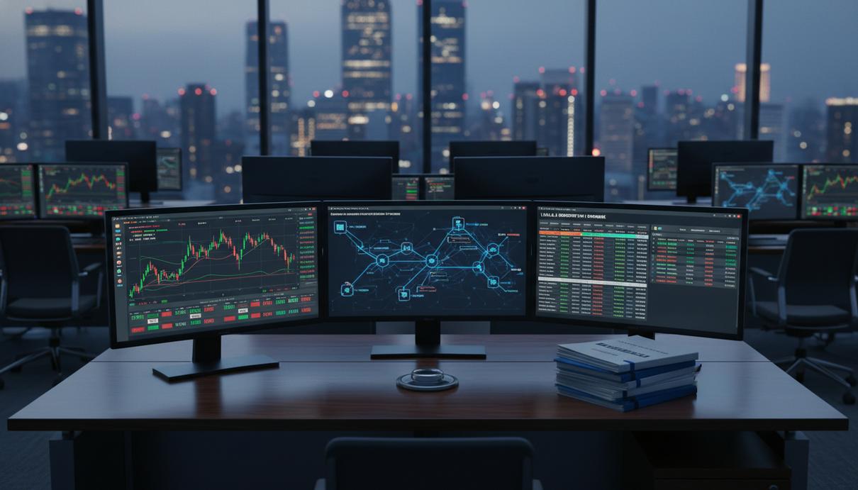 Современный финансовый офис с мониторами, отображающими графики криптовалют, данные стейблкоинов и блокчейн-сети. На рабочем столе лежат регуляторные документы.
