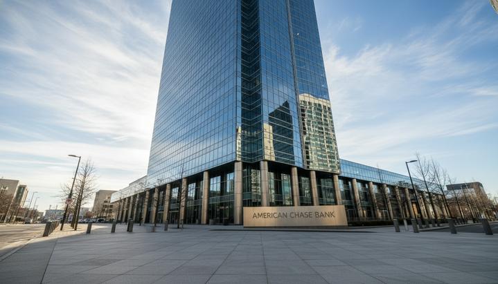 Современное офисное здание из стекла и стали, штаб-квартира финансовой компании, отражается в воде у основания.