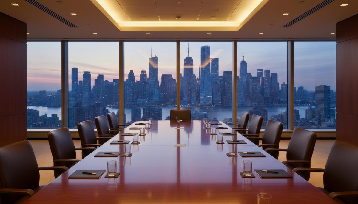 Пустой зал заседаний в небоскребе с панорамным видом на вечерний деловой центр Нью-Йорка и отражениями на полированном столе.