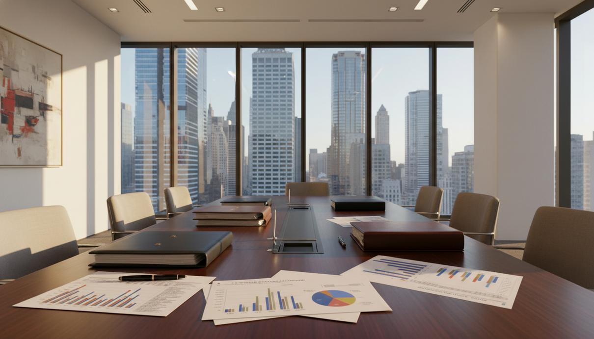 Интерьер современного офиса с видом на финансовый квартал, на столе лежат папки и документы.