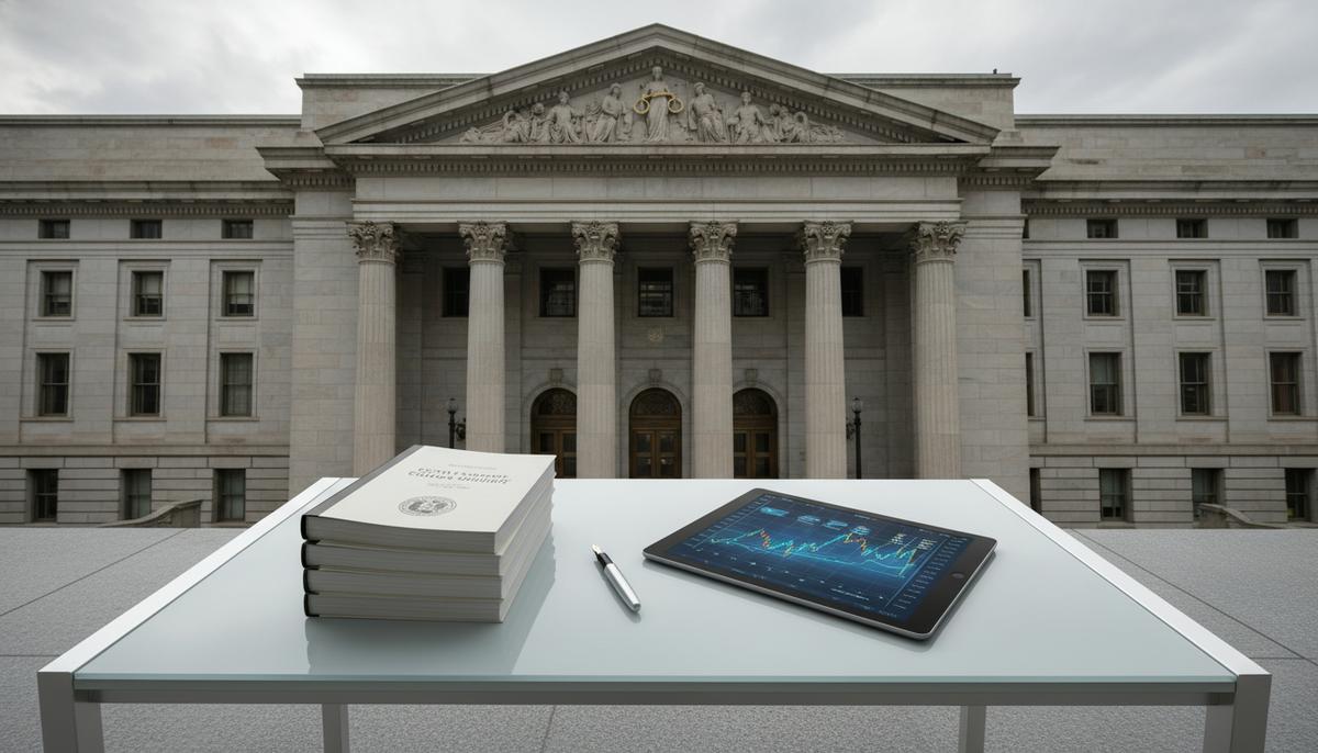 Фасад крупного финансового учреждения. На столе перед ним стопка отчетов, офисные принадлежности и планшет с графиками, символизирующие процесс регулирования.