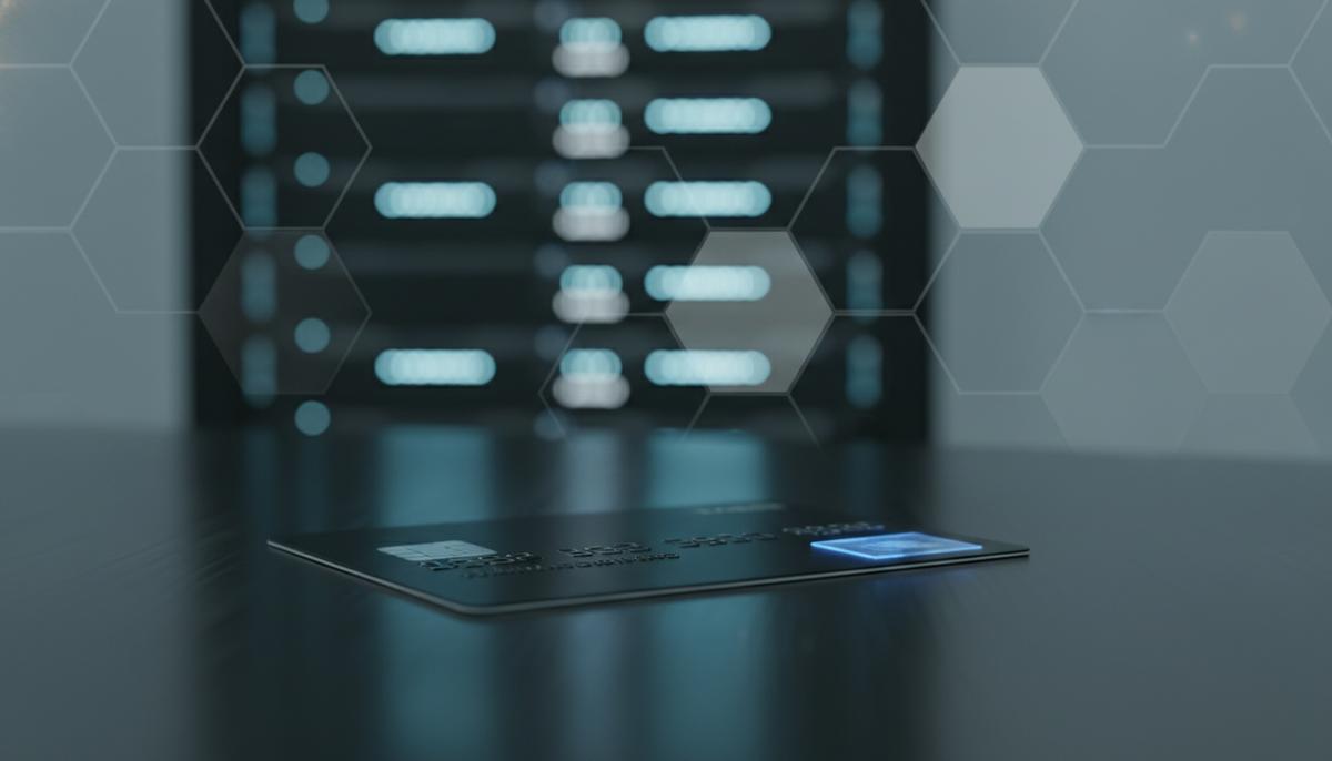 Кредитная карта с подсвеченным чипом лежит на темной поверхности на фоне размытых огней серверной комнаты.
