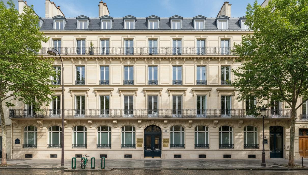 Фасад офисного здания в классическом парижском стиле на улице Реомюр в дневное время