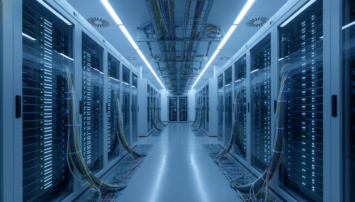 Ряды серверного оборудования в современном дата-центре с синей подсветкой кабелей и индикаторов