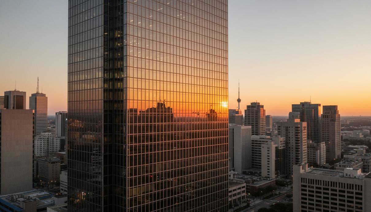 Стеклянный фасад современного офисного здания в финансовом квартале в лучах закатного солнца.