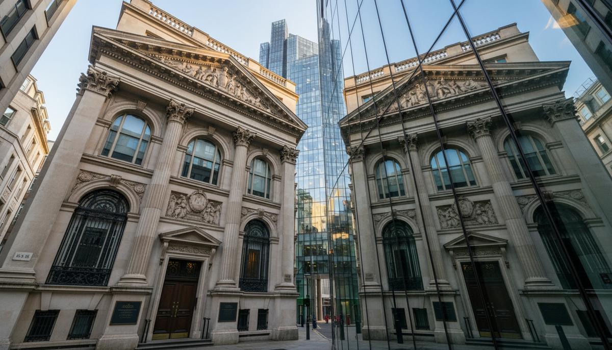 Фасад старинного каменного банка в финансовом квартале Лондона, отражающийся в стеклянных окнах современного небоскреба.